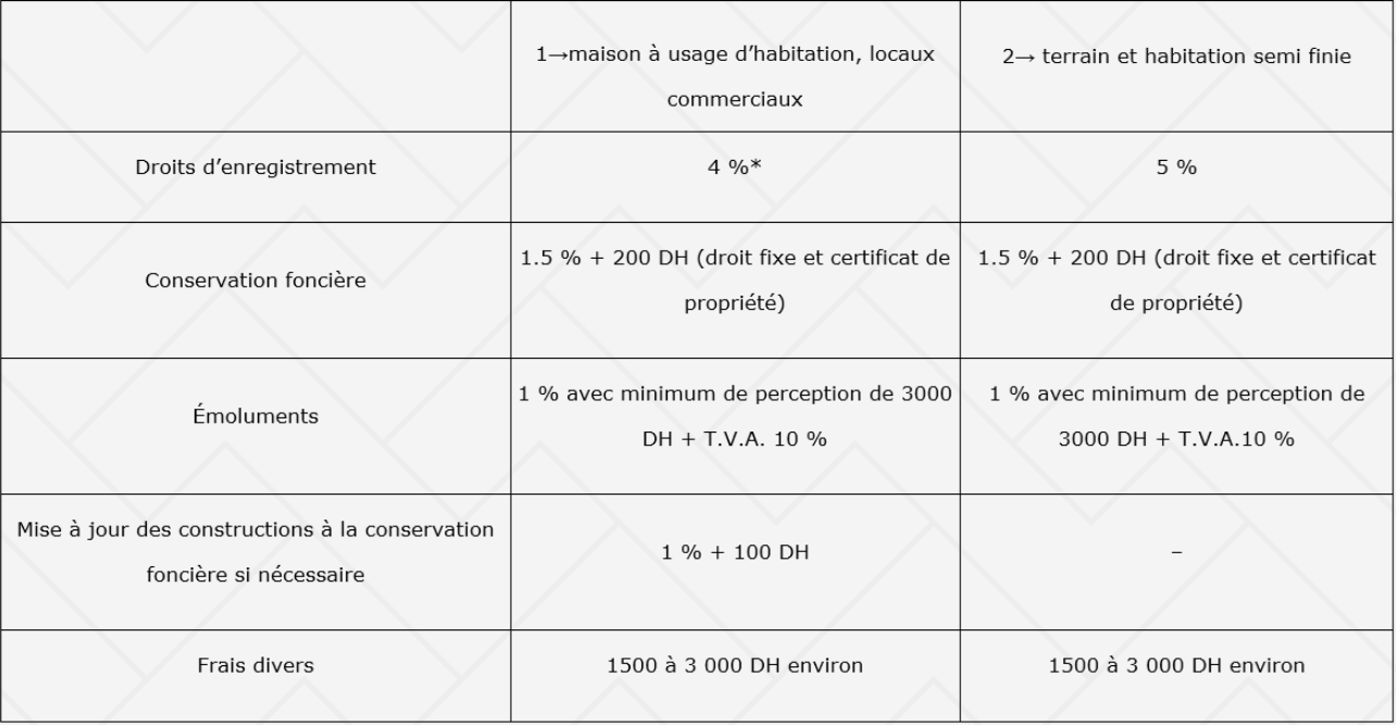 Au Maroc, les frais concernant une acquisition immobilière varient selon la nature juridique du bien. Voici le cas des deux ventes principalement rencontrées :